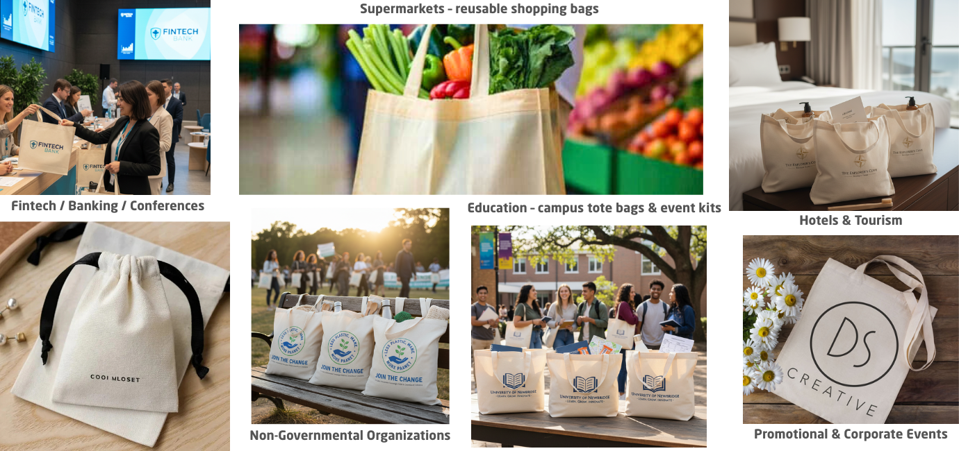 Con un enfoque en la excelencia y la satisfacción del cliente, Oasis International transforma las tradicionales bolsas de algodón tipo tote y los tejidos en productos premium que reflejan tanto funcionalidad como atractivo estético. Nuestro equipo garantiza que cada artículo esté cuidadosamente elaborado, sea duradero y respetuoso con el medio ambiente. Ya sea para el uso diario, merchandising de marca o proyectos especiales, nuestras bolsas y tejidos de algodón ofrecen fiabilidad, elegancia y un toque de sofisticación. Asóciese con nosotros para acceder a productos que combinan calidad global con diseño innovador, adaptados específicamente para los mercados internacionales.